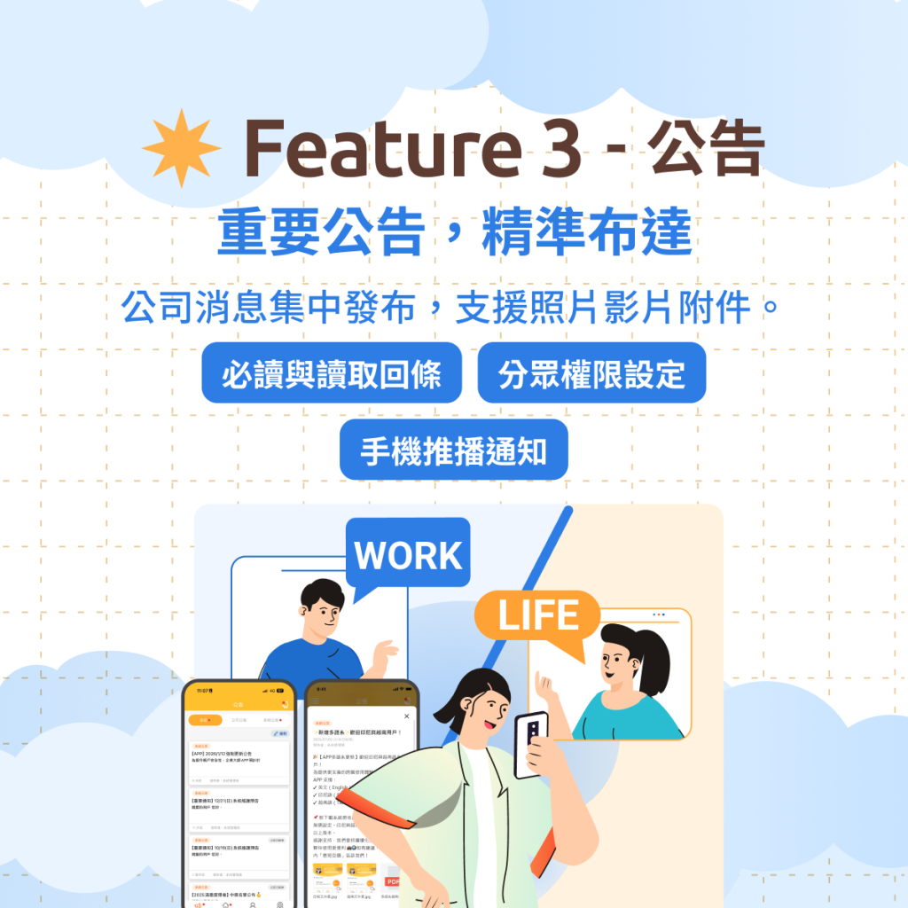 - 正式分眾公告:用系統發公告,可以放照片、影片或檔案。還能設定「必讀」置頂,確保大家都看到。