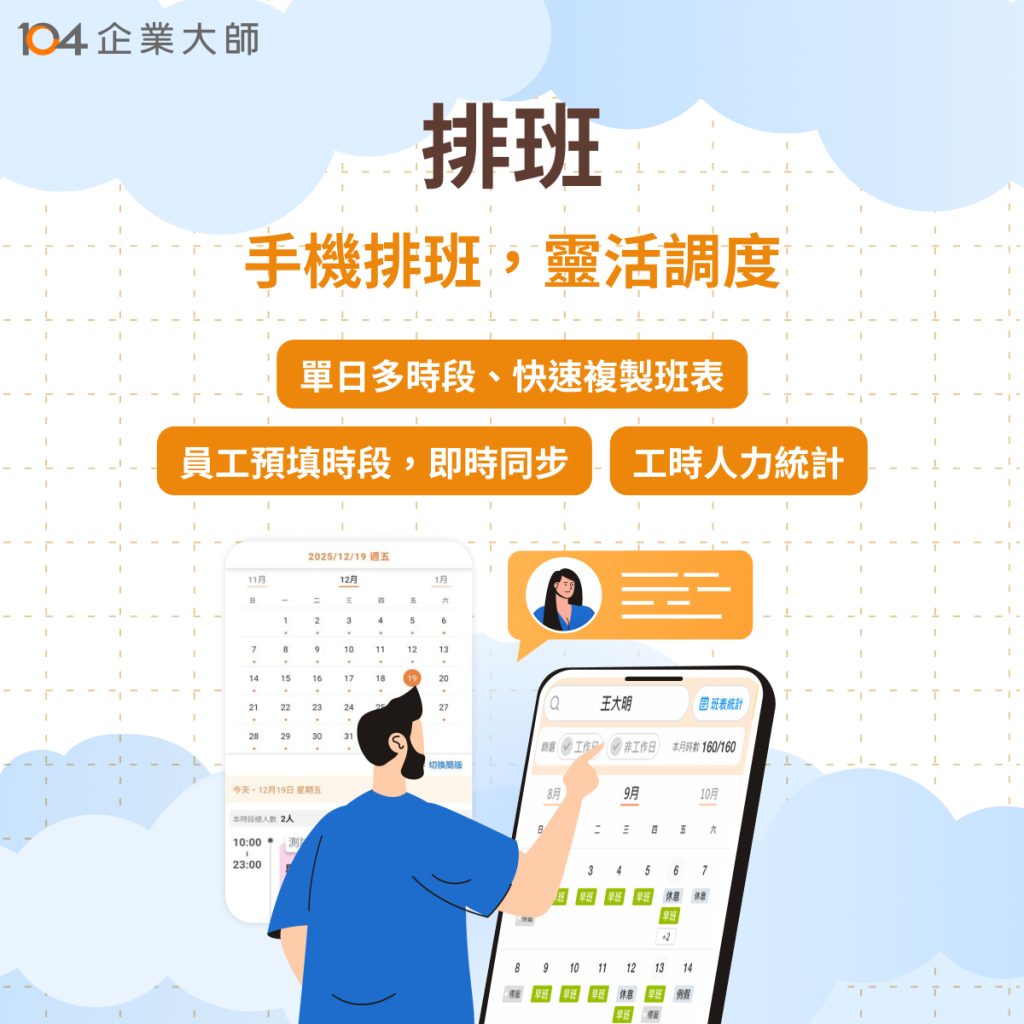 用了 104 企業大師後,業務到客戶那邊用手機 GPS 進行外勤打卡;工讀生用 App 自己排班;加班費系統自己算。現在,陳經理發薪前只要花 3 小時看一下系統跳出的異常提醒,剩下的時間都能拿去幫公司規劃參展。