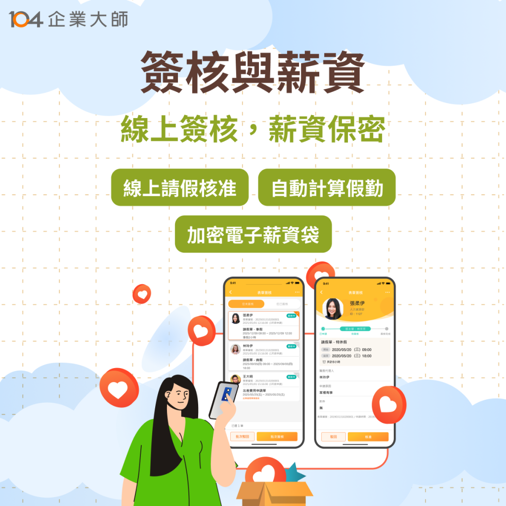 目前104企業大師提供免費試用三個月,百人以上企業推薦 HR Max 人資系統,讓你的打卡、請假、加班及工資流程都合法,歡迎點入連結詢問專員>>立即了解