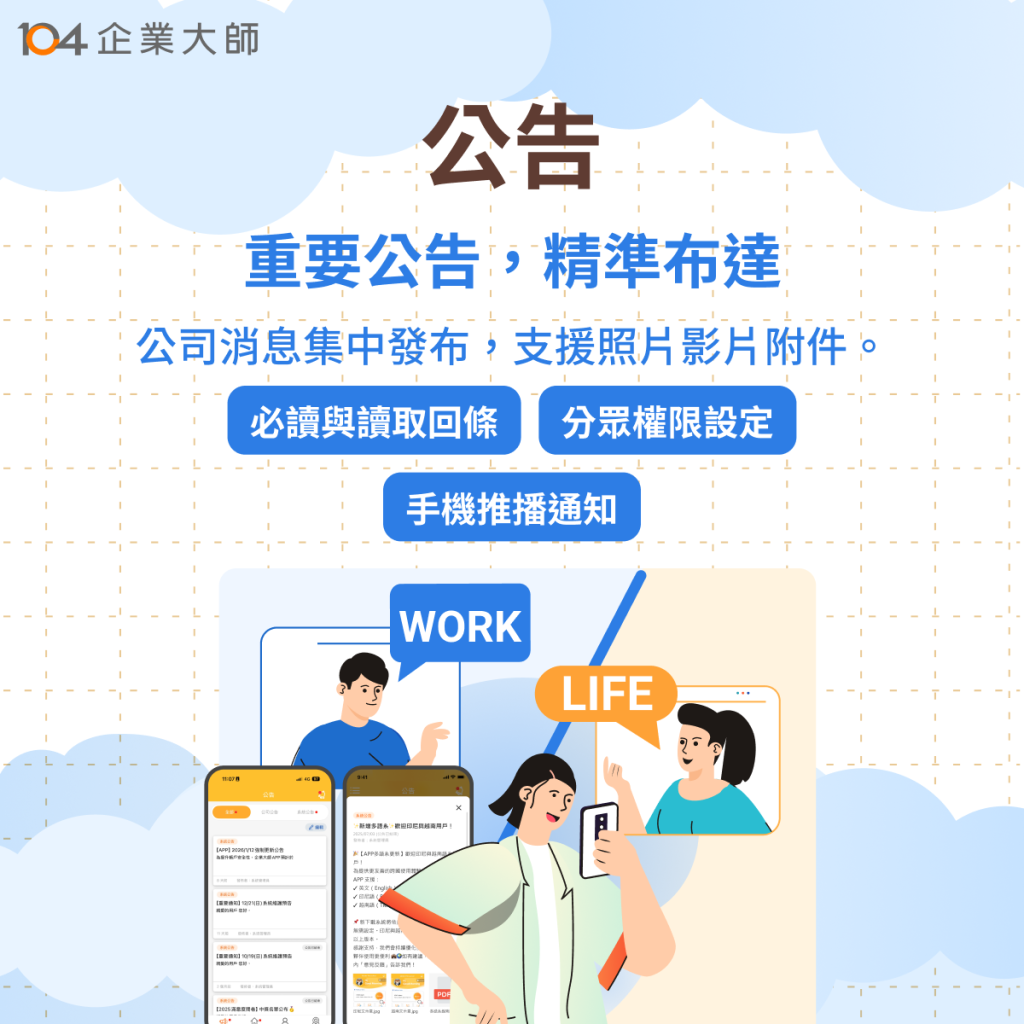 - 權限分流管理:設定誰能看(例如:獎金辦法只給業務看),不相干的訊息不會吵到員工,公司機密也安全。