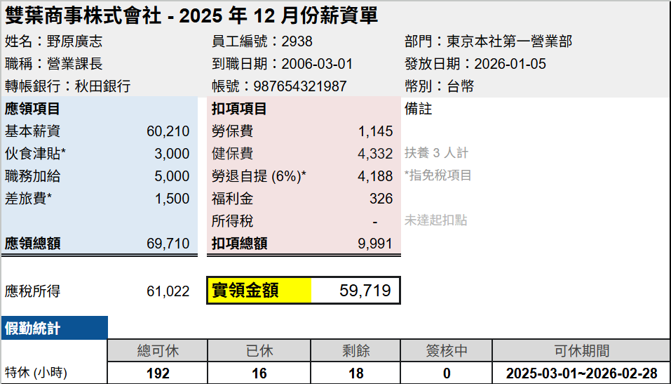 以下以營業課長「野原廣志」的薪資單為例,實際試算 3 種常見情境。在進入計算前,需先依據前述公式確認廣志的「工資結構」:
