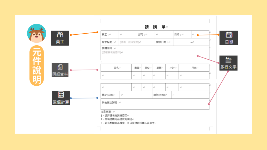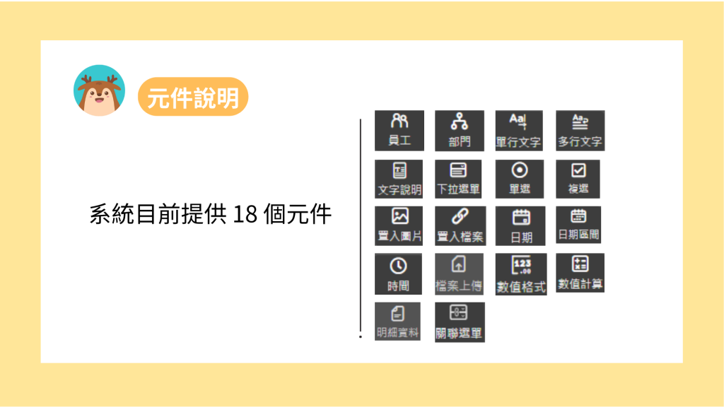 - 智慧小幫手:「員工」、「部門」元件會自動填上資料,再也不怕有人寫錯名字