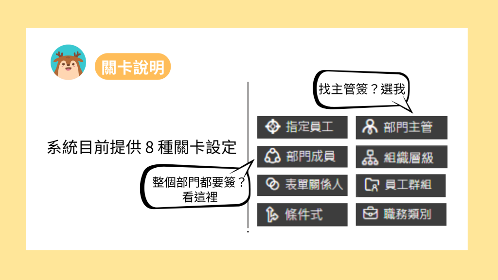 解決方案:別再被人情或過時的規定綁架!企業大師讓你的簽核流程長了眼睛!你可以自由設定 8 種關卡,想讓單子怎麼跑,就怎麼跑。