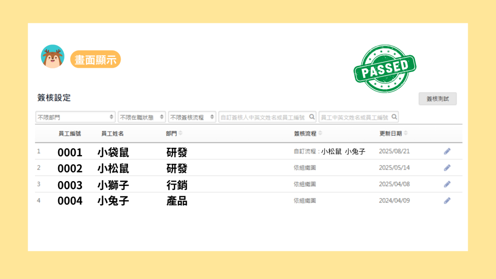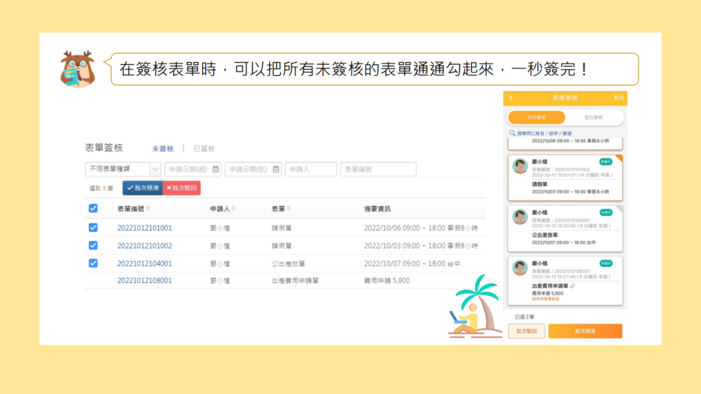 - 簽核開無雙模式:主管面對一堆待簽文件,只要帥氣地全選,按下「批次核准」,瞬間 KO!超有成就感!