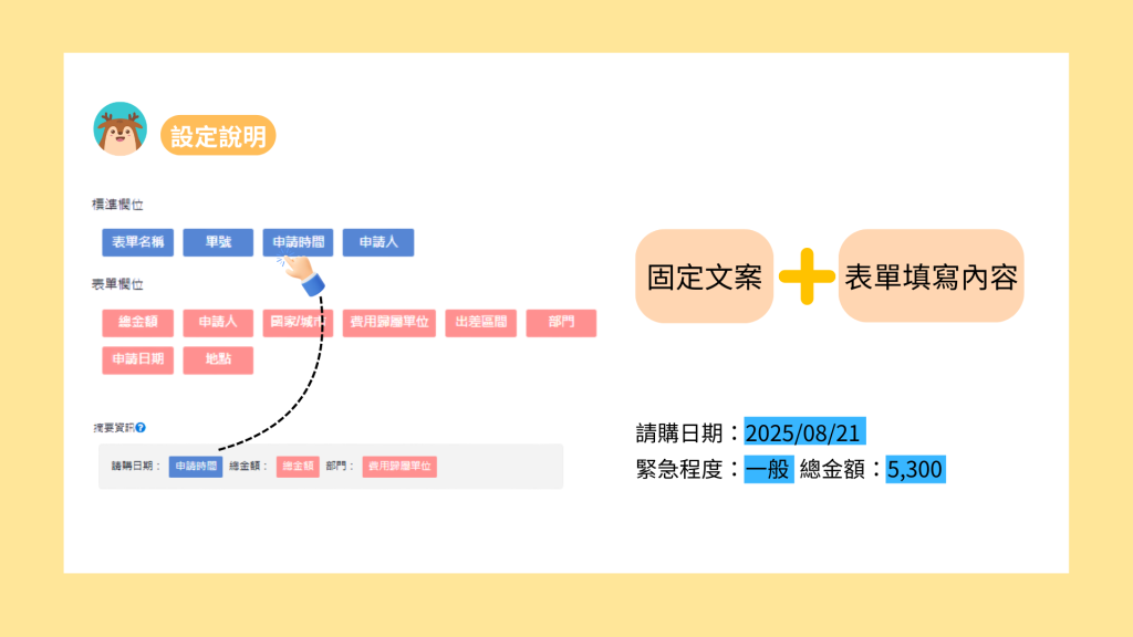 - 簡單設定: 把「請購日期」、「總金額」等重要欄位,拖到摘要區。
